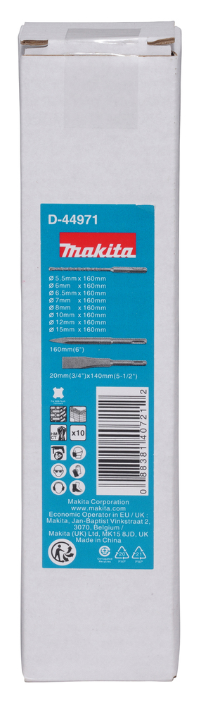 D-44971T.C.T urbju un kaltu komplekts plastmasas kastē SDS-PLUS perforatoriem. Komplektā 10 urbji un 2 kalti. Urbju izmēri svārstās no 5,5x160 līdz 15x160 mm. Komplektā iekļautie pīķis 160 mm un kalts 20x140 mm.